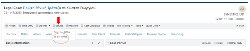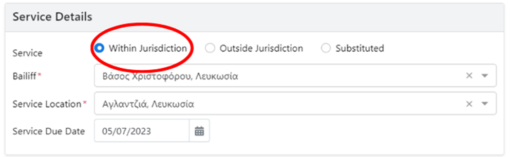 Note: Bailiff and Service Location fields will be visible only when choosing a substituted service method which requires to be assigned to a bailiff.