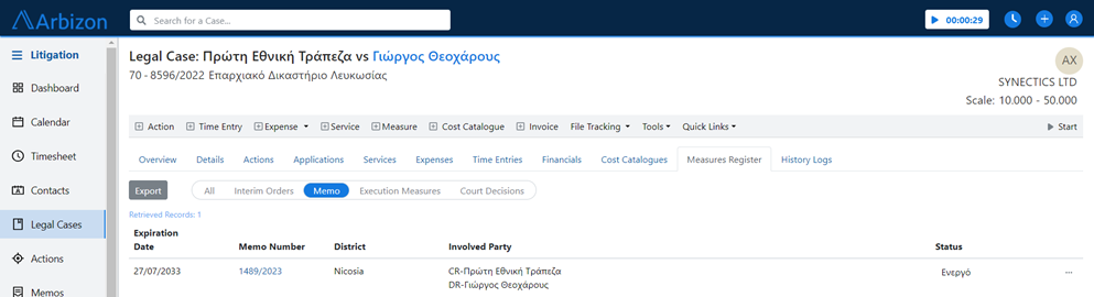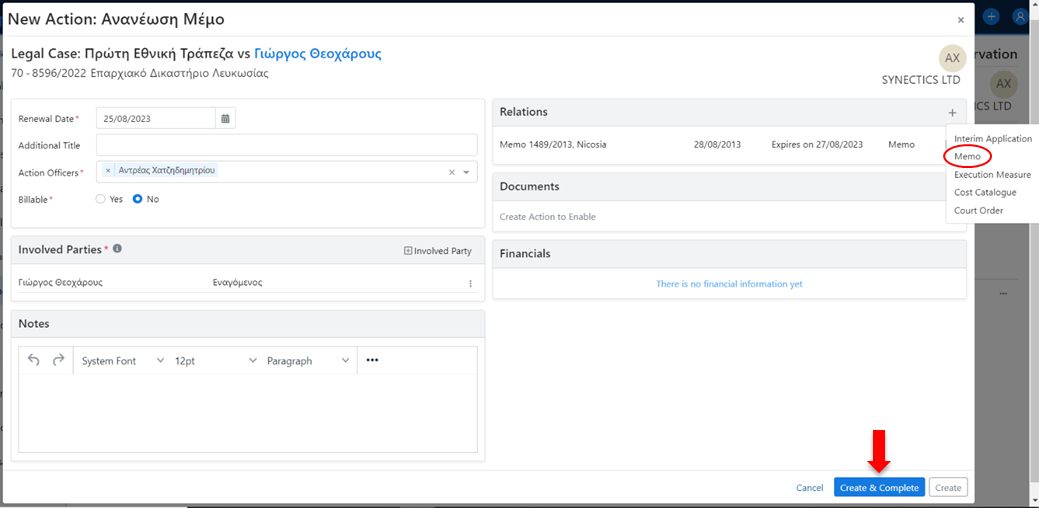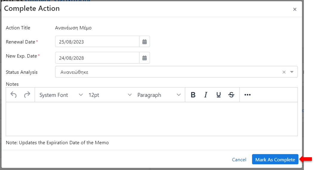 Mark as Completed the Action “Ανανέωση Μέμο” to Complete the MEMO Details (Renewal Date and New Exp. Date)