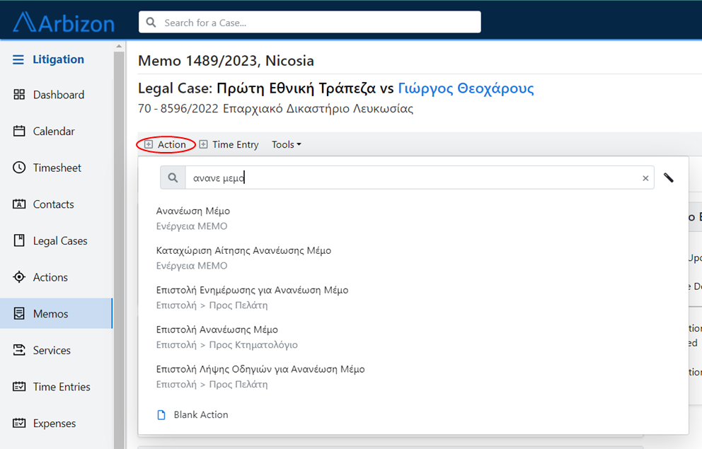 Click on the + Action button, search for and select the Action Ανανέωση Μέμο.