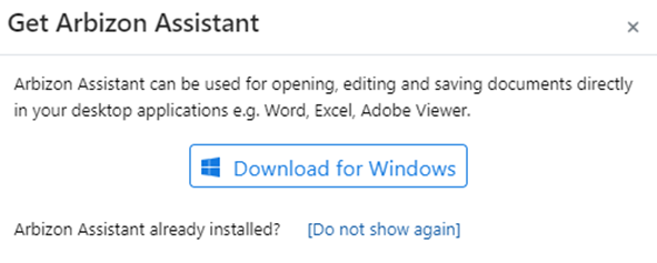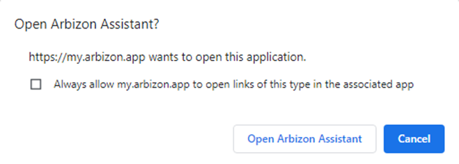 If you see a dialog like below click the checkbox “Always allow my.arbizon.app to open links of this type in the associated app” and click Open Arbizon Assistant. This way the dialog will not be shown every time you open a document.
