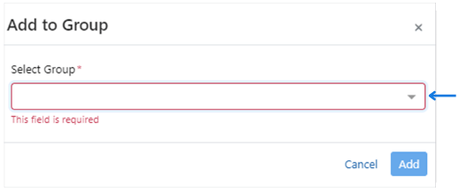 The new Group Name appears in the Select Group field, on the Add to Group modal. Click on the Add button to add the Contact to the Group.