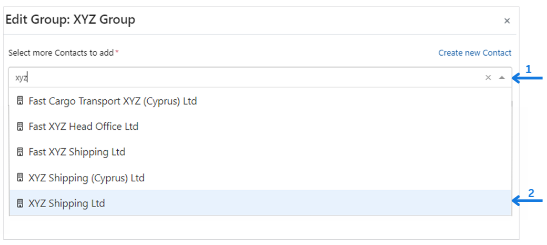 On the Edit Group window, in the Select more Contact to add field, type the name of the contact you want to add to the Group. If the contact record exists, select it.
