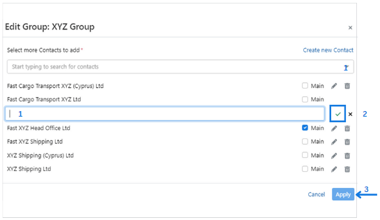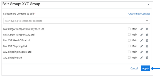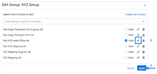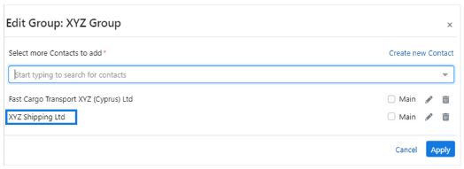 You can edit an existing Group to add multiple Contacts to the Group, define the main contact of the Group, and add notes next to each Group member.