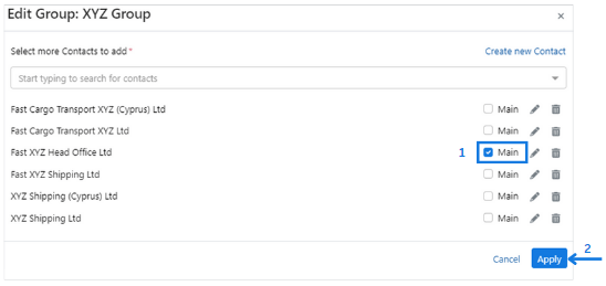 On the Edit Group window, check the Main box to the left of the Contact you want to mark as the main contact of the group.